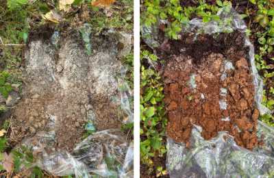 At each site, we collect about four cups of soil using a soil auger. Typically, 3–4 augers are taken from different spots to ensure the sample is representative of the site. Each auger is compared to the others to make sure that they are similar in texture and colour. We collect the soils into bags and freeze the samples as soon as possible.